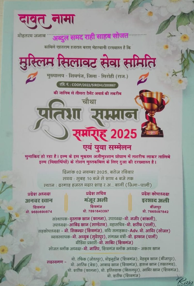 *मुस्लिम सिलावट सेवा समिति द्वारा 9 जिला स्तरीय चौथा प्रतिभा सम्मान समारोह दिनांक 2 नवंबर 2025 रविवार को मदार शाह दरगाह जोड़ बाली जिला पाली में सुबह 10 बजे से आयोजित होगा समिती मिडिया प्रभारी मोहम्मद साबिर ने जानकारी दी कि प्रतिभा सम्मान समारोह में जोधपुर, बाड़मेर, बालोतरा, ब्यावर नागौर उदयपुर, पाली,,जालौर सिरोही जिले के समस्त सिलावट समाज के प्रतिभावान विद्यार्थी जिन्होंने सत्र 2025 में कक्षा 5 में ए ग्रेड, एवं कक्षा 8 से 12 तक के बच्चे और स्नातक स्नातकोत्तर मे 60% या इससे अधिक अंक प्राप्त किए उन प्रतिभावान विद्यार्थियों को सम्मानित किया जाएगा।* *सचिव- मंजूर अली ने बताया कि समाज के लिए उत्कृष्ट कार्य करने वाले एवं समाज सेवी सहीत जिला राज्य एवं राष्ट्रीय स्तर पर खेल-कूद प्रतियोगिता में प्रमाणित खिलाड़ी भी सम्मानित होंगे*