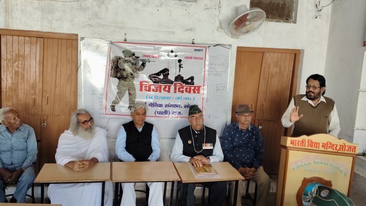 सोजत। भारतीय सेना के अद्भुत साहस, रणनीति और बलिदान को हमेशा याद किया जाएगा उक्त उद्गार पूर्व सेनिक संगठन के सचिव फौजी अशोक सेन ने स्थानीय रामेलाव तालाब स्थित सैन बगेची में पूर्व सेनिक संगठन द्वारा आयोजित 54 वें विजय दिवस पर कार्यक्रम में व्यक्त किए उन्होंने कहा कि विजय दिवस सेना के वीर जवानों के साहस, अटूट समर्पण और पराक्रम की पराकाष्ठा का प्रतीक है। कार्यक्रम के अतिथि सुरेश ओझा ने कहा कि हमारी सेना पर हमें गर्व है हिंदुस्तान की सेना का मुकाबला करना आसान नहीं है। सार्जेंट नाथू सिंह भाटी ने कहा कि देश के उन वीर जवानों को नमन करते है, जिन्होंने मातृभूमि की रक्षा के लिए अपने प्राण न्योछावर कर दिए उन्होंने 1971 के युद्ध का विस्तृत वर्णन किया।